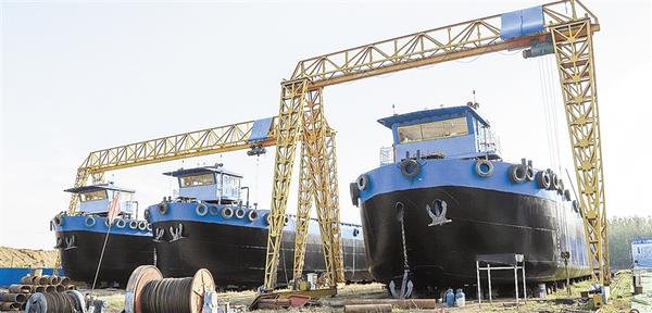 目前,在周口中心港周口申华造船厂,30艘千吨货轮一字排开同时建造。据了解,周口申华造船厂是我市最大的造船厂,拥有百余名造船经验丰富的工匠,撑起周口造船业的脊梁,成为我市开展沙颍河航运、打造海上“丝绸之路”的重要支撑产业。图为完工的千吨货轮。记者 梁照曾 摄
