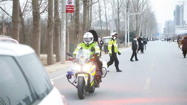 6时30分,天刚蒙蒙亮,寒风刺骨。沈丘县交警大队城区中队出动十余人组成“铁骑队”,维持考点门前交通秩序,设立车辆禁行区,用警用摩托车护送考生。沈丘县交警大队城区中队党员辅警肖欢欢说:“疫情防控背景下开展研究生考试,很多工作需要细化,只要能维持好考点的交通秩序、方便考生,再辛苦也值得!”沈丘县交警大队城区中队中队长刘涛说:“昨天接到任务后,我们立即进行多方面协调,让沈丘县的所有考生,不管是不是封控区的,都能顺利抵达考点进行考试。”