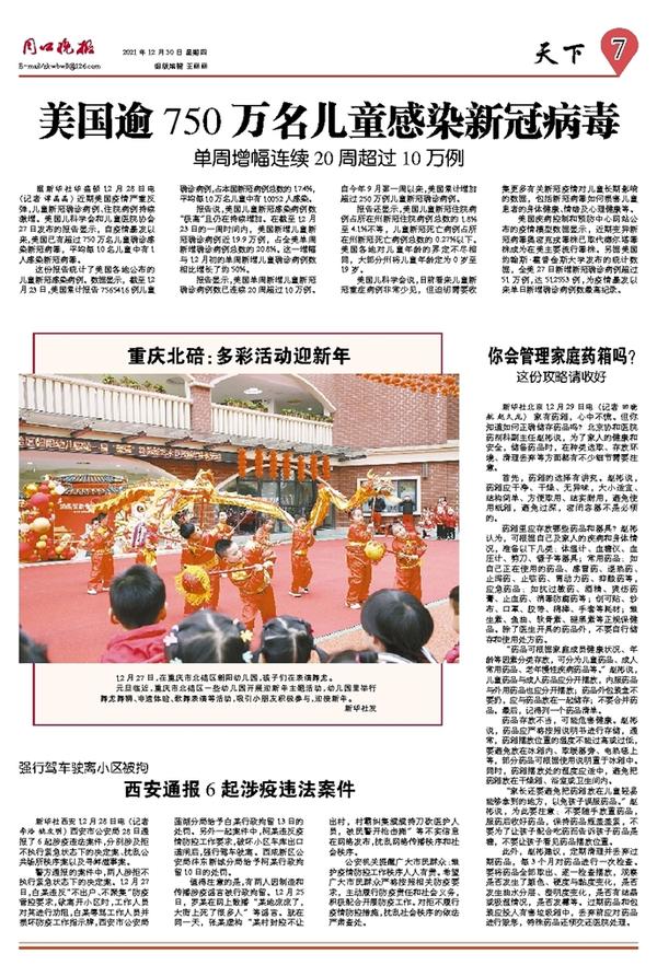 这份报告统计了美国各地公布的儿童新冠感染病例。数据显示,截至12月23日,美国累计报告7565416例儿童确诊病例,占本国新冠病例总数的17.4%,平均每10万名儿童中有10052人感染。