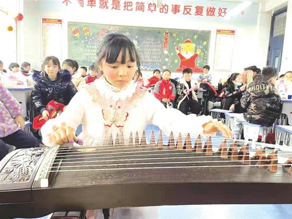 2021年12月31日,周口莲花路小学一学生在晚会上弹奏古筝。当天,该校以班级为单位举行了庆元旦文艺晚会,美丽的图案画满了黑板,窗户上也挂满了五彩的气球和喜庆的窗花,现场其乐融融。通讯员 李娇娇 摄