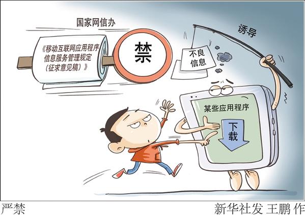 为了进一步规范移动互联网应用程序信息服务管理,国家网信办1月5日公布《移动互联网应用程序信息服务管理规定(征求意见稿)》,向社会公开征求意见。征求意见稿提出,应用程序提供者不得通过虚假宣传、捆绑下载等行为,或者利用违法和不良信息诱导用户下载。 新华社发 王鹏 作