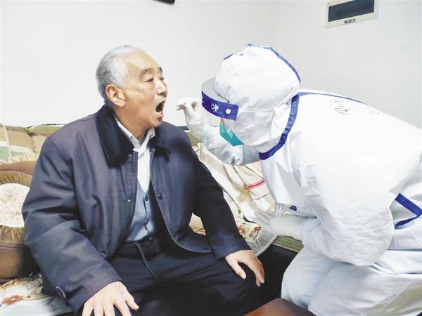 “龚爷爷,您好!了解到您不方便到核酸检测点,我们到您家为您做核酸检测。”11时,城乡一体化示范区文昌办事处建业社区工作人员申屠事平、杨凯杰以及派驻该社区参与核酸检测的市中心医院医护人员刘书杰,敲开了居住在建业社区的90岁老人龚庆喜的家门,经过测温、消毒、信息录入等环节后,医护人员为老人顺利采样。针对辖区内行动不便的高龄老人、孕妇、幼儿、残障人士等特殊困难群体,示范区各办事处“敲门行动”工作专班工作人员会入户了解核酸检测情况,进行采样检测,确保“不漏一户、不漏一人”。