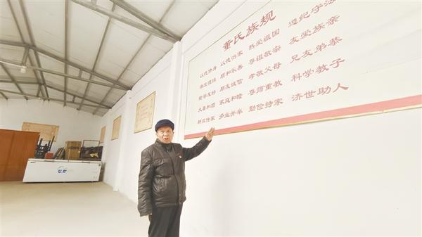 距董汉民老人家不远处,有一个董氏会堂,这是他们传家风、树家规、扬家训的场所。会堂四周悬挂的社会主义核心价值观、家训、家规展板格外醒目。
