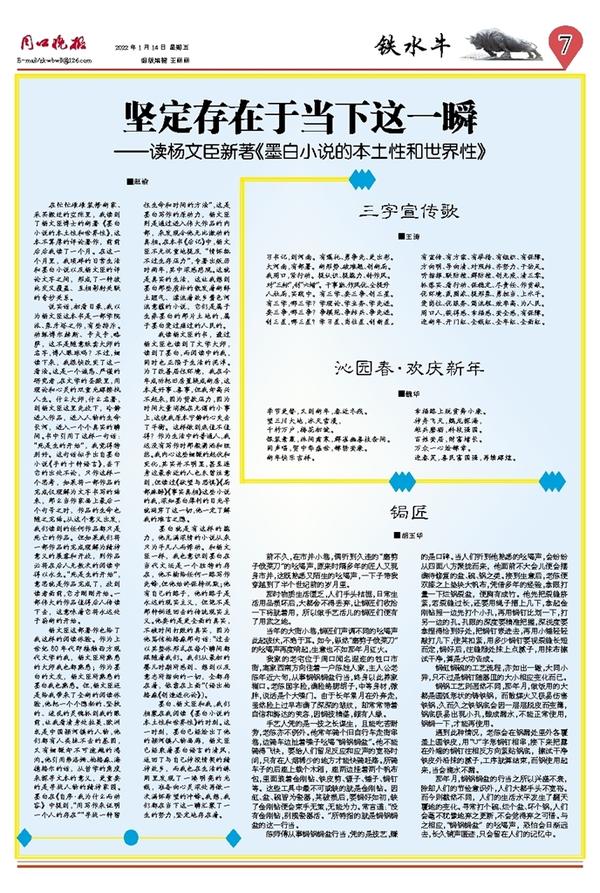 墨白、杨文臣和我,我们相聚在我阅读《墨白小说的本土性和世界性》的时刻。这一时刻,墨白已经绘出了他的颍河镇人物画廊,杨文臣已经乘着墨白语言的清风,返回了与自己神投情契的精神故乡,而我也在生活的蛛网里发现了一缕明亮的光线,准备向心灵深处再做一次满怀希望的冲锋。我想,我们都在当下这一瞬汇聚了一生的努力,坚定地存在着。