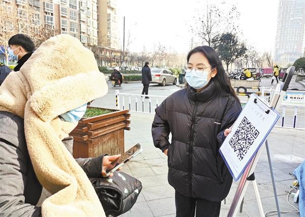 1月15日,周口市中心城区建业社区工作人员在社区门口提示居民扫二维码填写相关信息。为有效应对当前严峻复杂的疫情形势,充分运用大数据开展疫情防控工作,近日,我市启用周口市通行码信息管理系统(简称“周口通”),实现信息化赋能疫情防控。②18记者 孙安平 摄