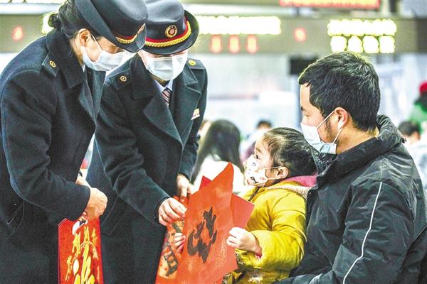 1月17日,贵阳客运段工作人员在贵阳火车站为候车旅客送上福字与春联。当日,2022年春运启动。2022年春运从1月17日开始,至2月25日结束,共40天。新华社记者 陶亮 摄