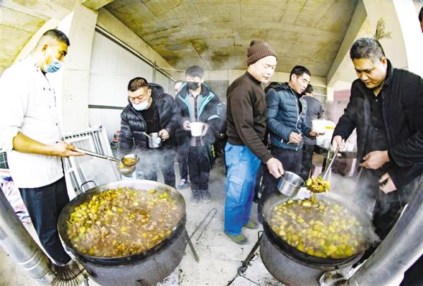 指挥部外,两口大铁锅正在炖着鸡肉,饭香氤氲。近5个多月来,万基地产抽调大部分兵力奋战在星空城项目,午饭一般是做好运到工地,但是每周六,都要做一次铁锅炖,改善生活,这顿午餐也成为很多人的念想。中午12点多,铁锅飘香,到了开饭的时间,工人与领导一起排队打饭,现场欢声笑语。这样的大锅饭,吃的不仅是滋味,更有浓浓的袍泽之情包含其中。万基地产的凝聚力、战斗力,在这一碗铁锅炖鸡美食中得到最好的体现。