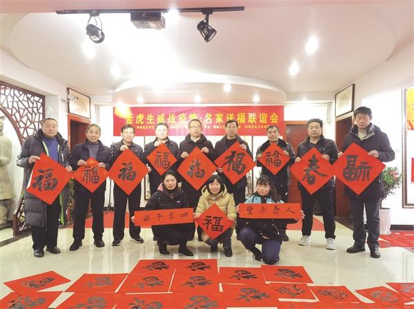 1月24日,春节临近,中国书法之乡郸城县处处墨香飘逸,由郸城县文广新旅局、县文联主办,县文艺家志愿者协会、中州文化艺术传媒承办的“金虎生威战疫情·名家送福联谊会”,邀请该县知名书法家齐聚一堂,共写春联,并集中送“福”下乡,免费赠给群众。记者 徐松 摄