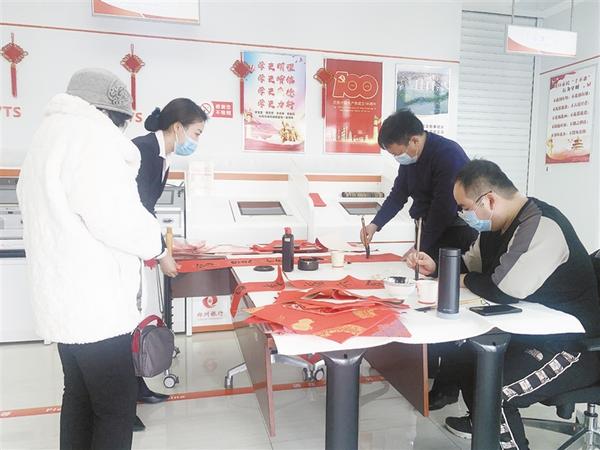 1月19日,郑州银行周口分行邀请市书法家协会的书法家们,在该行营业厅开展“写春联 送祝福”活动。书法家们满怀创作热情,笔走龙蛇,泼墨挥毫。风格迥异、墨宝飘香的对联和“福”字,映红了整个营业厅,表达了该行对广大客户的新春问候和诚挚祝福,此项活动也是该行巩固拓展党史学习教育成果、落实“我为群众办实事”的具体举措。
