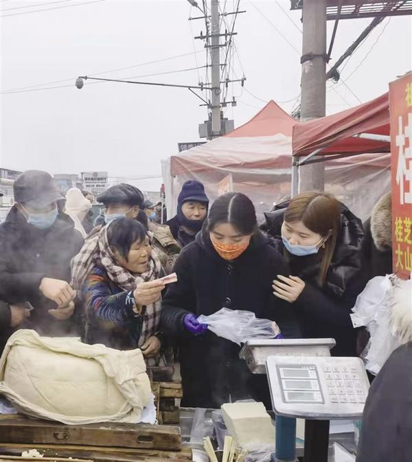 智大爷刚从一摊位“抽身”,提着他的“战利品”准备“奔赴”下一个摊位。“每年过年前都会跟老伴儿来集上转转,买点热豆腐、肉、菜,家里其实也不缺,但是过年要是不赶集,能叫过年吗?”智大爷是智新庄村村民,他手里拿的热豆腐是固墙镇家家户户过年必备的美食——固墙热豆腐。“我从鹿邑来的,姐姐在买豆腐,我在这儿等她。”9岁的张家瑞说,她每年放寒假都会和家人一起到固墙探亲,过年的时候逛逛集市,顺便买些热豆腐带回鹿邑。抬眼望去,固墙热豆腐摊位已经被人群围得里三层外三层,一双双拿着钱的手争先恐后伸过来,火爆的生意让摊主咧嘴直笑。