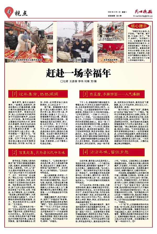 “来喝正宗小鱼汤、丸子汤咯。”“酵子馍、酵子馍,10块钱一兜了。”“果子,甜果子。”农历腊月二十五,记者置身于商水县固墙镇热闹的集市中,立刻就被包裹在一阵阵卖力的吆喝声里。拿着欢庆新年的大红春联、红烛,品尝着热豆腐、手擀捞面,沉醉在热气腾腾的小镇烟火气中,自然而然寻见了小镇人民幸福的中国年。