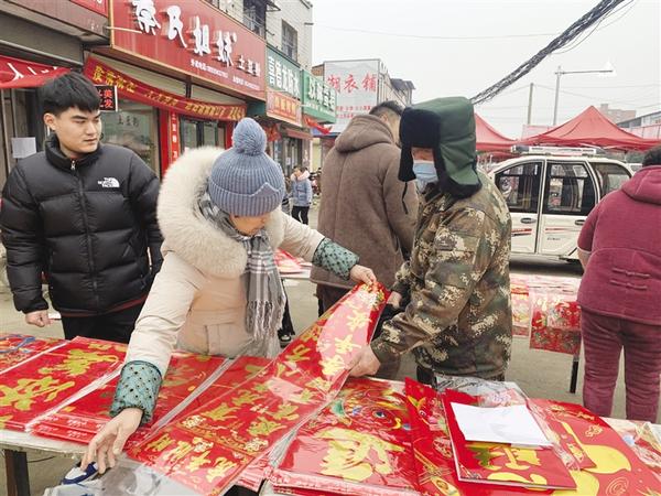 春节将至,不断映入眼帘的喜庆“福”字映衬着摩肩接踵的人群。赶集时,家家都要买几张年画、几副春联。今年,以“虎”为主题的年画春联成为主角。“这个虎头年画今天已经脱销了,这个‘年年有余’的也喜庆。”摊主王大姐一边帮顾客挑着年画一边笑着说,年前,她早早囤好了近百种样式的老虎年画,现在看来还是不够卖。其实,除了过年必备的年画春联,她还准备了红灯笼、红烛、中国结、电子鞭炮等,也十分畅销。“现在禁止燃放烟花爆竹,大家的环保意识也都强了,对电子鞭炮的接纳程度越来越高,这不,我这刚批的货马上就卖完!”王大姐说。