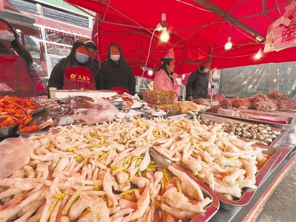 揣着冰糖葫芦,再步行数十米,就到了“许猛卤肉”熟食摊,酱牛肉和秘制灌肠是熟食摊的“销冠”。“老乡,恁这牛肉咋卖的啊?”“58元1斤不还价,你先尝尝咱这个味儿好不好。”说着,店主许猛熟练切下一片肉递给顾客。“俺这肉都是现卤现卖,来买的都是老顾客,现在大家生活条件越来越好,吃东西就图个好吃、新鲜!”许猛说。