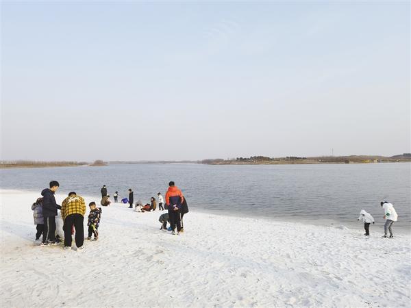 2月5日,市民在被网友称为周口“小三亚”的流沙河湿地公园白沙滩上游玩嬉戏。春节假期,流沙河湿地公园成为市民休闲好去处。