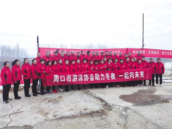 本报讯 2月9日早,周口市游泳协会在川汇区关坡村沙河河段举行集体游泳活动,47名冬泳爱好者一起下水,为冬奥助力,为奥运健儿加油。