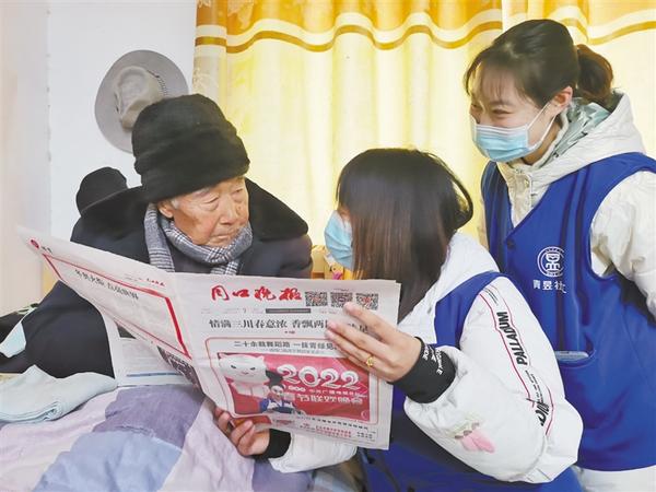 2月15日,商水县邓城镇敬老院内,社工为80岁的李东明老人读报。当日,商水县民政局、邓城镇人民政府、周口市青昱社会工作服务中心人员陪伴老人们一起过元宵节。记者 窦娜 摄