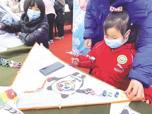 2月15日上午,“放飞春天——儿童DIY手绘风筝”活动在周口市文化艺术中心西广场如期举办。一名身穿红色棉服的小女孩在妈妈的帮助下,创作完成了一只画有“冰墩墩”形象的手绘风筝。 见习记者 杜营营 田亚楠 摄