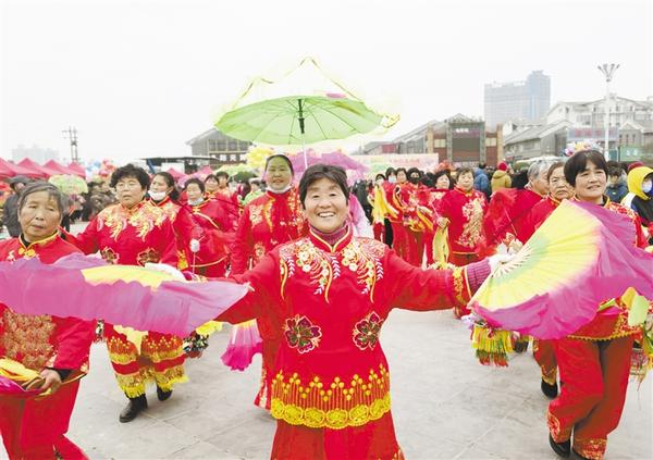 元宵节期间,具有浓郁地方色彩的民间文化活动在周口城乡集中展现,彰显了“道德名城 魅力周口”的丰富内涵。图为市民在关帝庙文化广场表演喜庆的担经舞。③10通讯员 李瑞英 摄