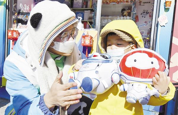 2月16日,北京冬奥会城市志愿者张文全(左)为一名儿童介绍冬奥会和冬残奥会吉祥物。 近日,北京市海淀区紫竹院街道城市志愿者服务站吸引了大批市民前来观看这里举办的奥运纪念品展览,这个展览是由收藏了5000多件奥运纪念品的城市志愿者张文全举办的。张文全把自己收藏的各类奥运会吉祥物、火炬、徽章、纪念品等40多件藏品带到现场,举办了这个小小的奥运纪念品展览,向市民和游人宣传奥运知识和文化。新华社记者 李欣 摄