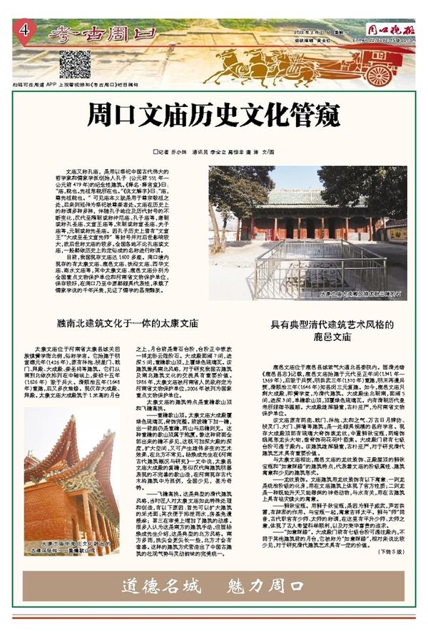 目前,我国现存文庙达1600多座。周口境内现存的有太康文庙、鹿邑文庙、扶沟文庙、西华文庙、商水文庙等,其中太康文庙、鹿邑文庙分别为全国重点文物保护单位和河南省文物保护单位,保存较好,在周口乃至中原都颇具代表性,承载了儒家学说的千年兴衰,见证了儒学的昌荣黯淡。
