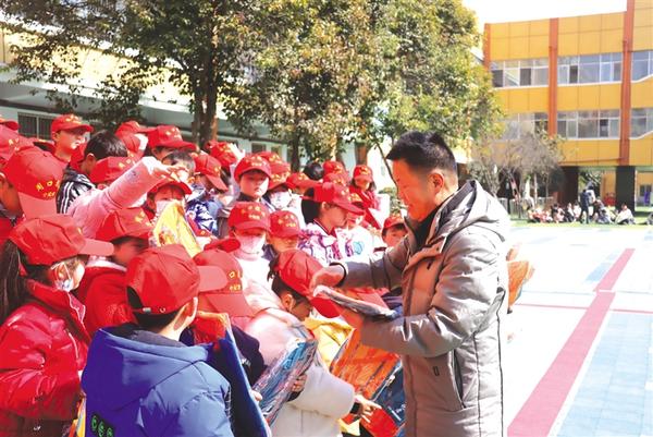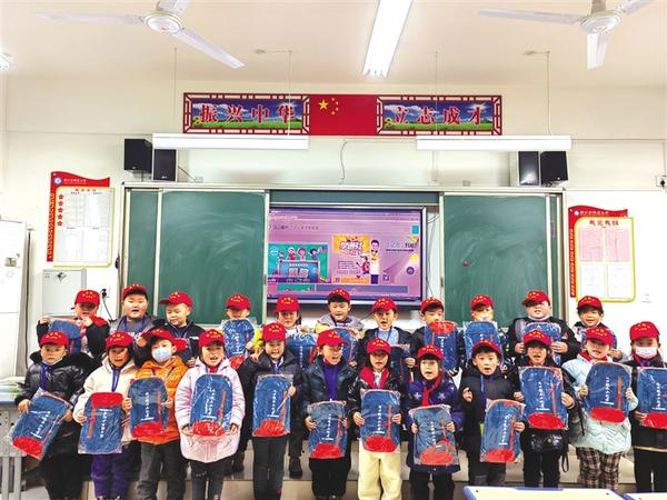2月18日,周口韩庄小学举行采访装备集中发放仪式,99名学生喜领小记者证、帽子、采访包。通讯员 张宁 摄