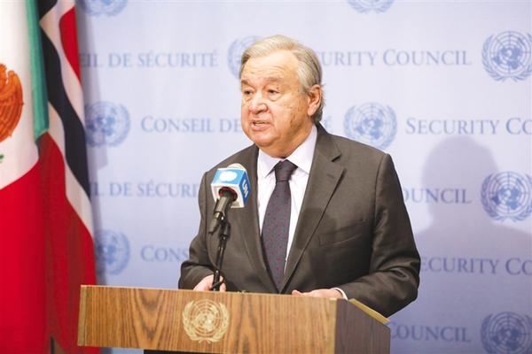 2月22日,联合国秘书长古特雷斯在纽约联合国总部的记者会上发言。 联合国秘书长古特雷斯22日强调,联合国决不放弃为乌克兰危机寻找和平解决方案的决心,同时呼吁有关各方保持克制,回到外交解决危机的轨道。新华社记者 谢锷 摄
