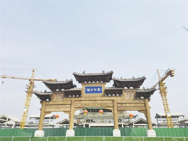 早春时节,古运河河畔一片静谧。距离河边不远处,周口建业运河古镇项目主体建筑施工已接近尾声,工人们头戴安全帽、佩戴口罩,按照工程进度进行作业。