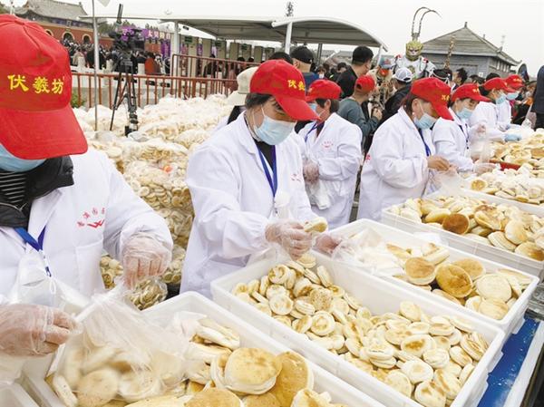 在太昊陵景区前的广场,只见戏台上,戏曲展演精彩不停;民间手工艺人手工制作的泥泥狗、布老虎等精美手工艺品一一展现;压缩馍、焦馍摊点前吸引了大量游客,成了许多游客逛太昊陵景区购买特产的首选。离开太昊陵时,游客们几乎人手一袋压缩馍。而人气最高的,当数张建淮的98万网红摊位。