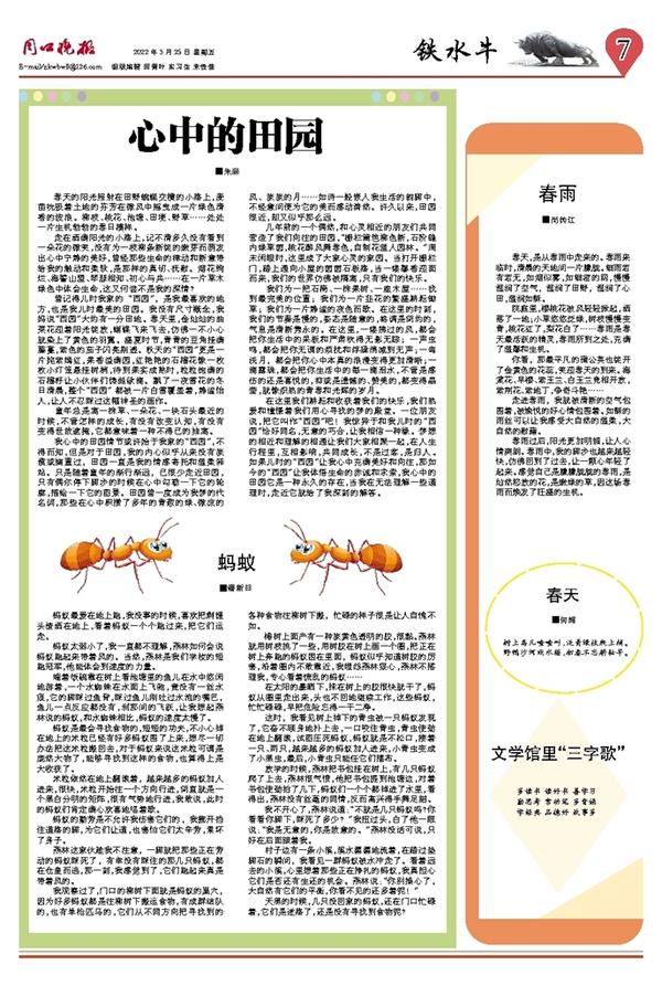 放学的时候,燕林把书包挂在树上,有几只蚂蚁爬了上去,燕林很气愤,他把书包提到池塘边,对着书包使劲拍了几下,蚂蚁们一个个都掉进了水里,看得出,燕林没有丝毫的同情,反而高兴得手舞足蹈。