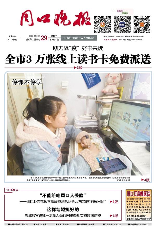 昨日,太康县毛庄镇毛庄小学六年级二班学生姜艳阳在家中上网课。目前,太康县近万名教师和10余万名学生每日相会在“空中课堂”,真正让广大学生做到停课不停学。记者 张洪涛 摄