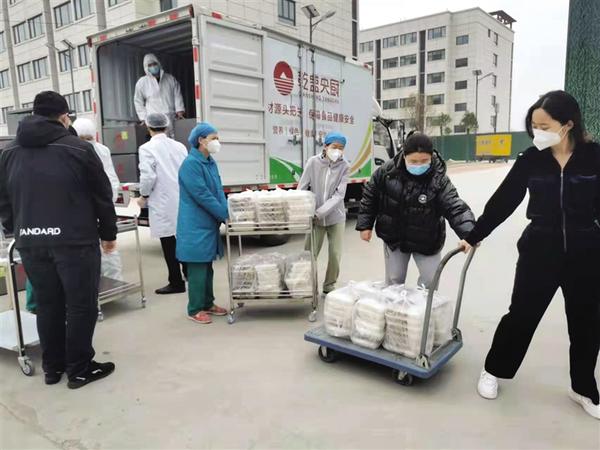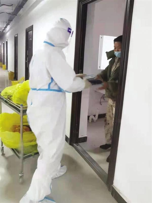 在这里,每日的食谱都深受隔离群众称赞,中午有炒鸡块、西兰花、人造肉、煮蛋、八宝粥和米饭,饭后每人还发个橘子。饭菜由医护人员送至隔离群众房间门口,饭后再集中回收清理。