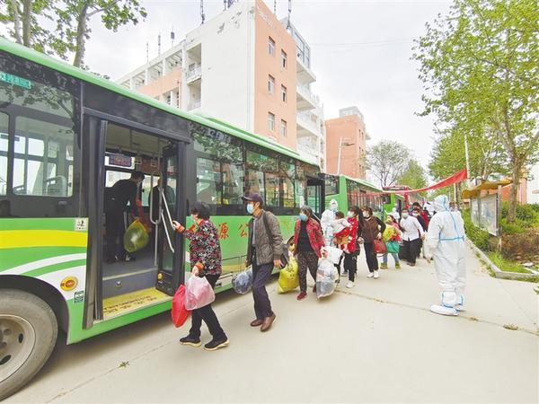 4月12日上午,在扶沟县职教中心集中隔离医学观察点,242名太康县转运扶沟集中隔离人员正式解除集中隔离,乘坐转运专车平安返程,由高贤乡“点对点”运送至行政村。他们回家后将进行7天居家健康监测,加强自我防护。