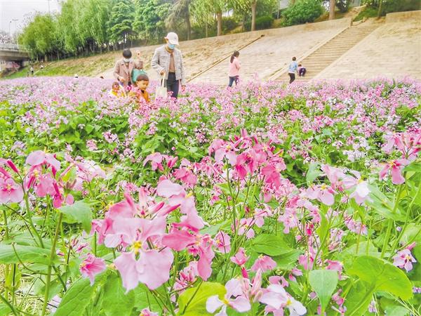 4月15日,周口市中心城区大庆路桥南沙颍河边的二月兰盛开,朵朵紫色小花开在纤细的茎蔓上,远看犹如一片紫色花海, 微风吹过,又似千万只舞动的彩色蝴蝶,让前来赏花的市民沉醉其中。记者 孙安平 摄