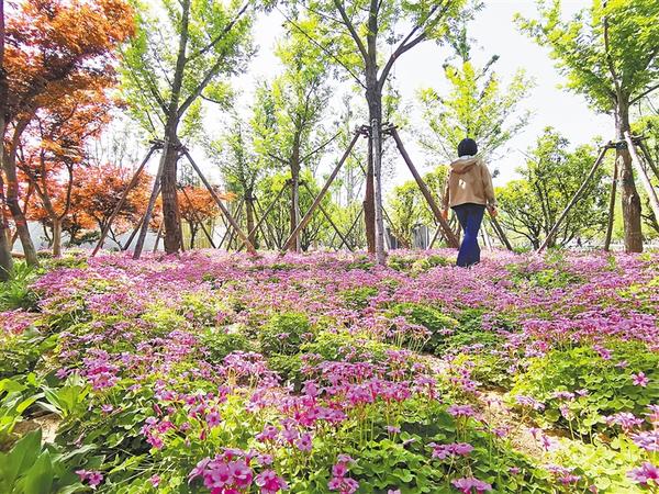 4月21日, 蜿蜒流淌的洼冲沟倒映着蓝天白云、绿柳红花,市民或在广场结伴游玩,或在亲水平台观河看景。