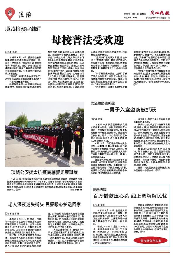 本报讯 4月23日,项城市检察院检察官韩辉应邀回到母校项城一中,为初一学生举办“法在我身边 尊法我带头”专题讲座。这位“学姐”通过“动漫故事+案例+释疑”等校园法律问题与同学们面对面,引得同学们掌声不断,高潮迭起。