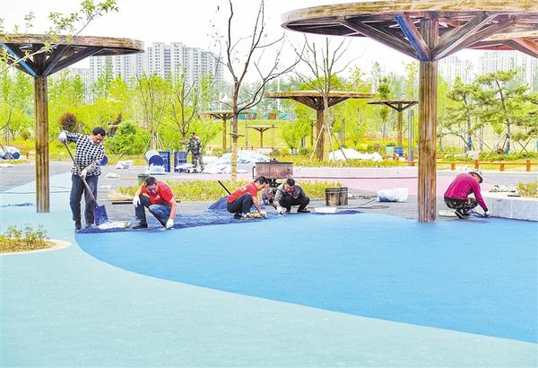 4月28日, 周口沙颍河湿地公园内工人正在游乐场铺七彩塑胶地面。据施工人员介绍,需要铺彩色塑胶地面的游乐场地共有3个区域,要20多天时间,因为这个区域距离小区比较近,每天来沙颍河湿地公园游玩的市民较多,为了保证施工质量,希望市民施工期内不要进入施工场地。记者 孙安平 摄