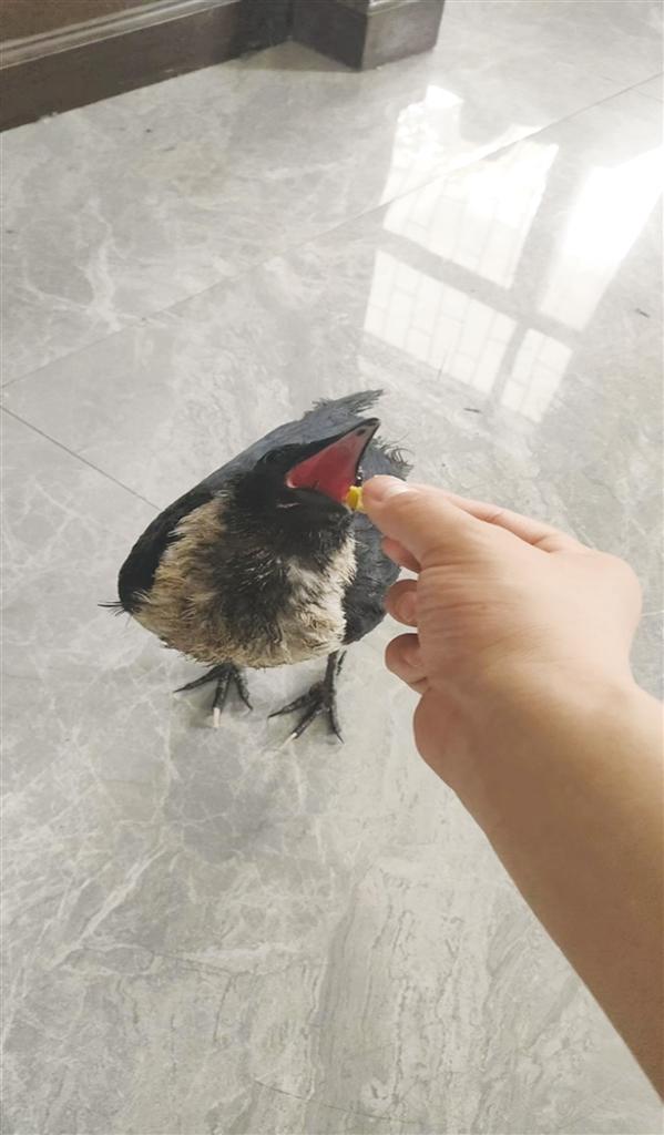 经刘芬老师介绍,该伤鸟体长近40厘米,长着一副坚硬的鸟喙,黑白相间的羽毛。说是喜鹊吧,又明显比喜鹊大,看外观像乌鸦,但是有一圈白色的羽毛。刘娜老师拿来水和馒头,用水泡发,揪成小粒状。杨杰主任闻讯拿来蛋黄,小家伙张大嘴等候着。杨杰主任细心喂食,随着喝水进食,小家伙身体状态明显好转。