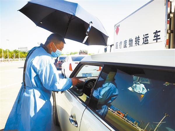 为切实落实好疫情防控措施,坚决守好“外防输入、内防反弹”防线,小桥社区卫生服务中心按照疫情防控要求,自去年10月底至今,每天安排9名医护人员在周口北高速出口实行“三班制”全天24小时值班,负责对入周人员进行体温监测和提供核酸检测服务。5月3日下午,小桥社区卫生服务中心的王飞舟在烈日下,一手拿着遮阳伞,一手拿着额温枪,为入周车辆上的人员进行体温监测。记者 王珂 摄