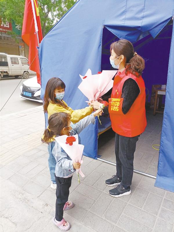 本报讯 “阿姨,你们辛苦了,节日快乐!”“我是咱社区的居民,为了感谢你们对我们的付出,在这个特殊的日子里让我的孩子为你们献上最真挚的祝福!”“谢谢你们的祝福,早上6点我们就忙着来组织做核酸了,都忘了今天是母亲节了。这些都是我们应该做的,平时的工作也多亏了你们的理解和支持,我们共同努力,相信疫情会很快过去的!”5月8日,在沈丘县清华园小区烟草局的值守点,一位妈妈带领两个萌娃走出家门,向志愿者王轲轲送来鲜花和节日的祝福后,迅速返回家中。这温馨的瞬间被王轲轲的同事王猛抓拍个正着。