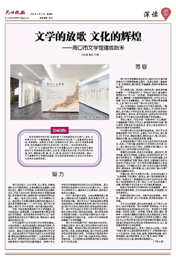 在前不久召开的周口历史文化座谈会上,市委书记张建慧强调:在全面建设现代化周口的新征程中,我们比以往任何时候都更加迫切需要从优秀历史文化中汲取精神力量。要以对历史负责、对未来负责、对周口负责的强烈责任感和使命感,大力传承弘扬优秀历史文化,擦亮周口文化标识,坚持以文化人、以文铸魂、以文聚力,用优秀传统文化滋养周口儿女、引领社会风尚,凝聚起建设现代化周口的精神力量。我们相信,有市委、市政府的鼎力支持,有深厚的文化积淀,有丰饶的文学沃土,有大批的文学人才,周口的文学事业和经济社会发展定会扶摇直上九万里!②15