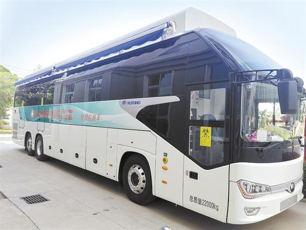 这辆移动核酸检测实验室(车)车身长14米,车顶带有伸缩遮阳伞,车内设有样本制备区、扩增分析区、试剂准备区三个功能区。车内还配有物资储备、样品存放和物品消毒等设施设备,采样完成后可直接进行检测,减少中间转运环节。