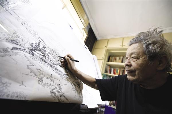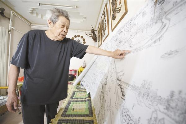 近日,在中心城区文明路原市文化局家属院,记者拜访了这位85岁高龄的德艺双馨的艺术家。他独居一室,深居简出,正潜心创作新作——沙颍胜境图卷。摄影、绘画、写剧本……葛庆亚是一位多栖艺术家。在其书卷、相片、胶卷、画作满壁的书房内,在灯光下,他那微卷的白发随着画笔而舞,如艺术精灵在歌唱。在既往的85个春秋中,70多个春秋里,他用笔、用镜头、 用艺术,记录着周口人民奋斗的身影和足迹,记录着沙颍河两岸的变迁,记录着周口的复兴梦。