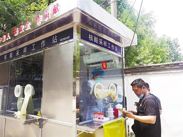 本报讯 5月25日11时30分许,记者在国槐街与人民路交叉口附近的核酸采样工作站看到,站内的工作人员正在为市民采样,还有市民正在咨询。“免费做核酸吗?有没有纸质版的核酸检测报告单?”“核酸检测是免费的,检测结果在支付宝上可以查询。”
