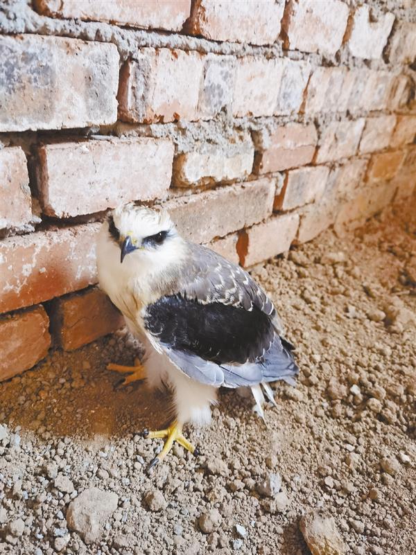 本报讯 5月28日下午,郸城县城郊乡一位居民在自家院内发现一只长得类似老鹰的鸟。这只鸟上体蓝灰色,下肢白色,有着一双明亮的红眼睛。该居民见这只鸟停在院内轻拍翅膀,久久无法飞翔,便报警求助。