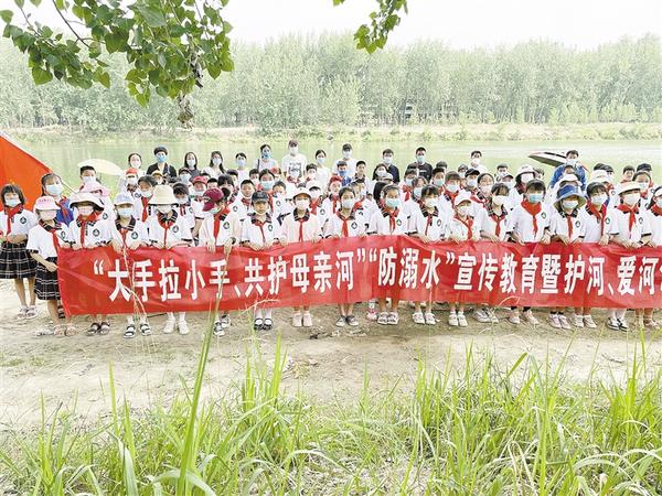 近日,周口市闫庄小学联合川汇区沙颍河管理段组织开展“大手拉小手、共护母亲河”防溺水宣传教育暨护河、爱河活动。图为参与活动的学生合影留念。 通讯员 郭霞 摄