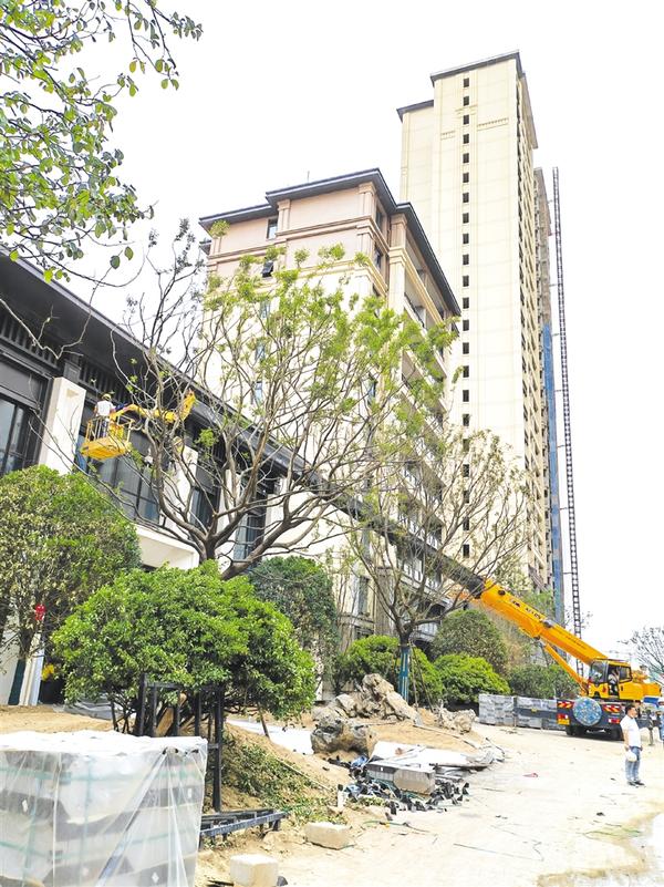 小区主景观乌桕园18棵高大乌桕树已栽植好,具有极高观赏价值的乌桕树树枝外展飘逸,树型独特,其下路径蜿蜒,坡地连片,几十名工人正在做土丘、栽小型植被,忙个不停;