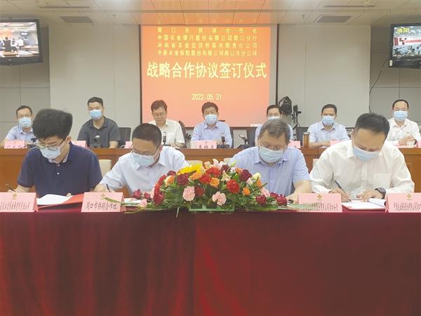 5月31日,农行周口分行与市供销合作联社、中原农业保险股份有限公司周口市分公司签订合作协议,创建服务乡村振兴新模式,增强服务“三农”新动能,奋力推动周口从农业大市向农业强市迈进,为我市国家级农高区建设和争创国家级临港经济区注入金融活水。记者 徐如景 通讯员 程飞帆 摄