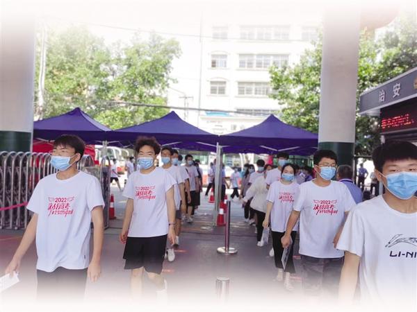 8点30分,考点大门正式开启,王赛赛和其他考生经过体温检测、出示核酸检测报告后有序稳步地进入考场,按照考点考场分布图,寻找自己的考场。学校中心位置遮阳棚下的校园志愿者服务站,服务台上摆满了口罩、消毒酒精、冷热饮用水和防暑药品,高二年级的学弟学妹们身着志愿者红马甲,向他们做出“V”字形手势,王赛赛顿感心里热乎乎的。