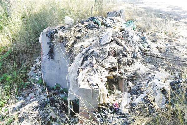 西华县艾岗乡境内安罗高速西侧,005县道凌云驾校路标牌附近沟内有大量陈旧垃圾和丢弃衣物
