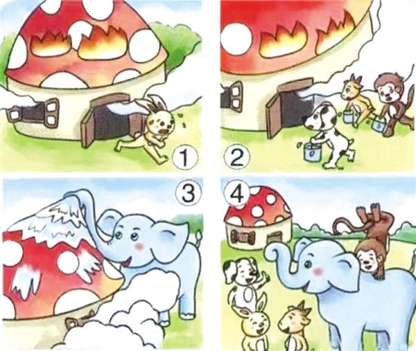 在外闲逛的大象远远看见了,急忙去河边吸了满满一鼻子水,快速走到小兔子的厨房前,使出全身的力气,用鼻子把水喷向着火的地方,房子的火很快就被扑灭了。小兔子开心地说:“谢谢你们,我的好邻居,有你们可真好!”(辅导老师:黄春昀)